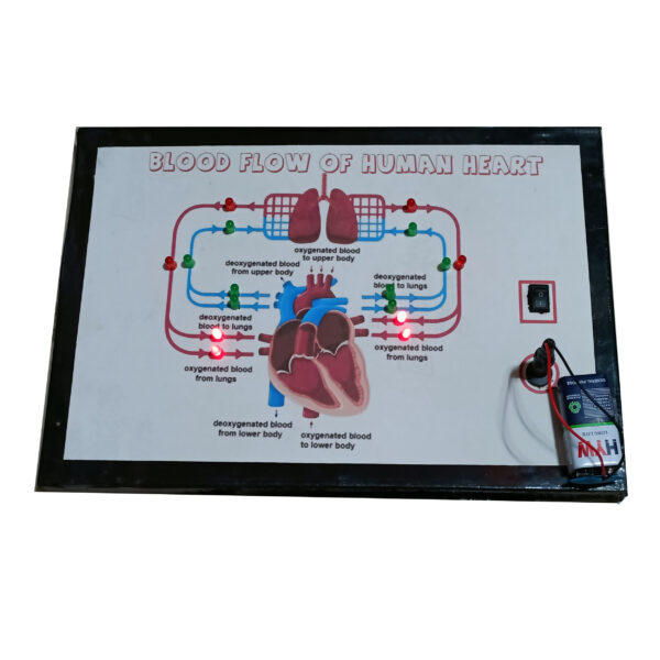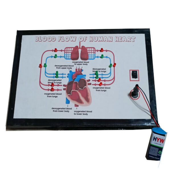 The Blood Flow of Human Heart Model visually represents the flow of blood through the human heart using an interactive LED circuit. The model simplifies the understanding of heart anatomy and blood circulation, making it suitable for educational purposes like school projects, science exhibitions, and biology demonstrations.